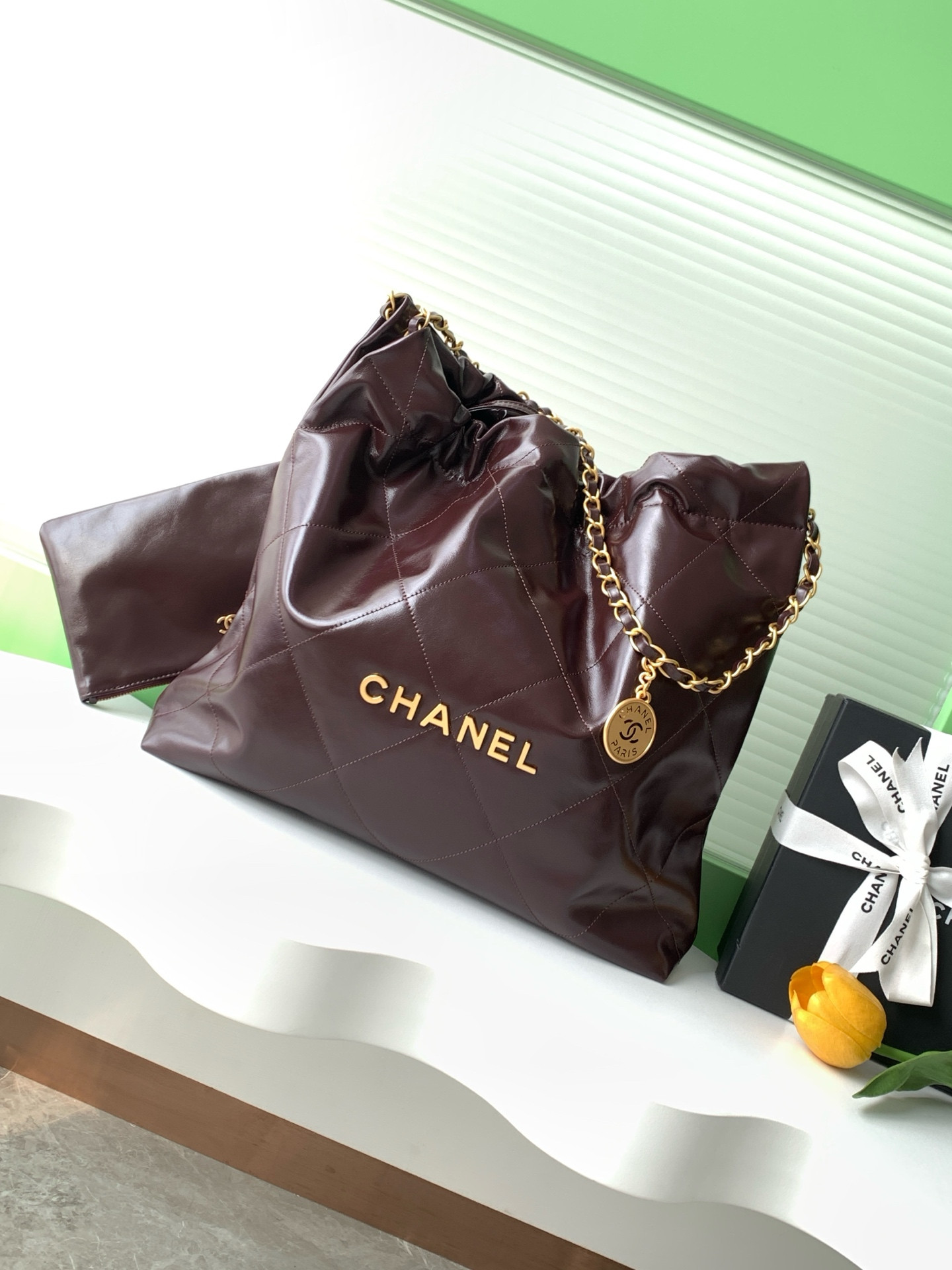 Ch**el 22 SMALL HANDBAG Shiny Calfskin BROWN 13.7×14.4×2.7 in