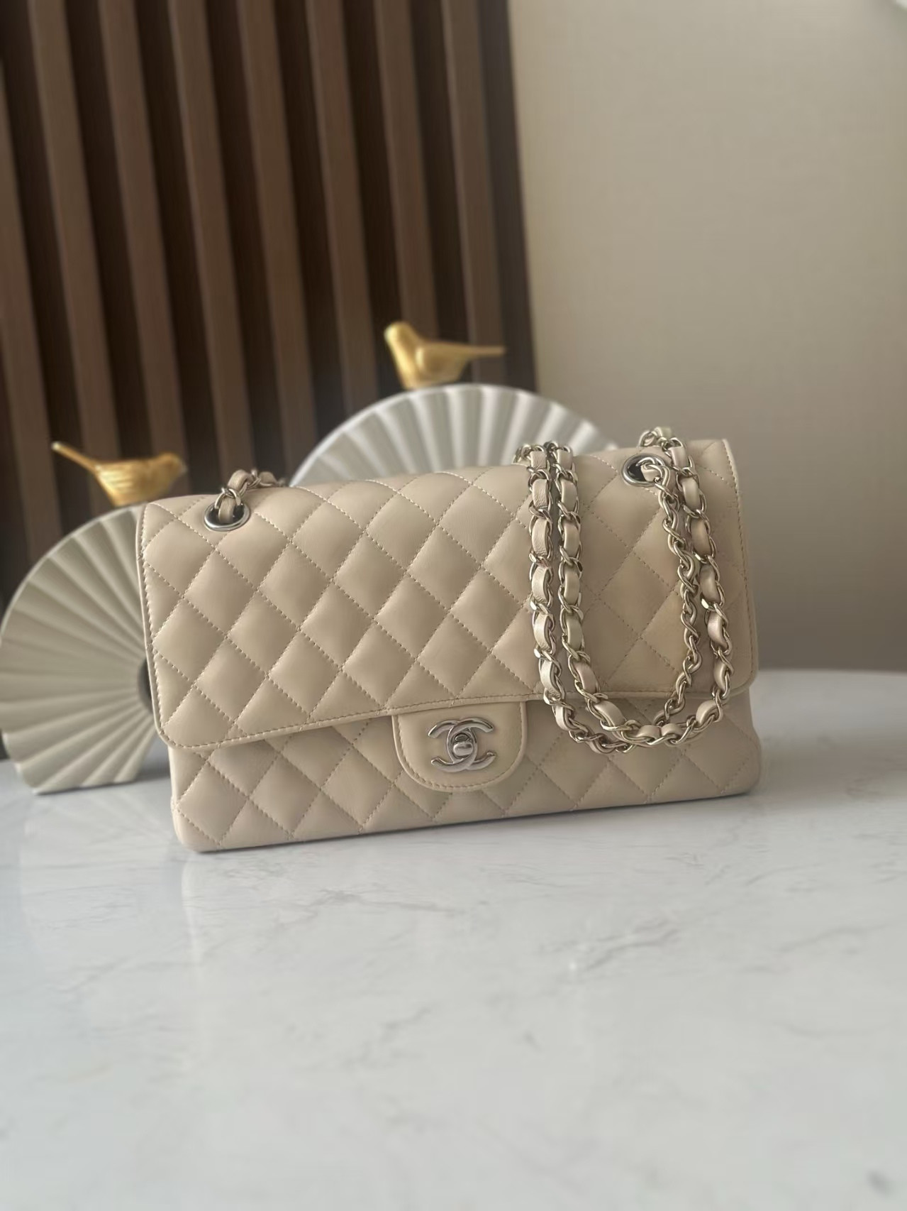 Ch**el Classic Flap Bag Pearlescent apricot-colored lambskin with silver hardware 15x25.5x6cm