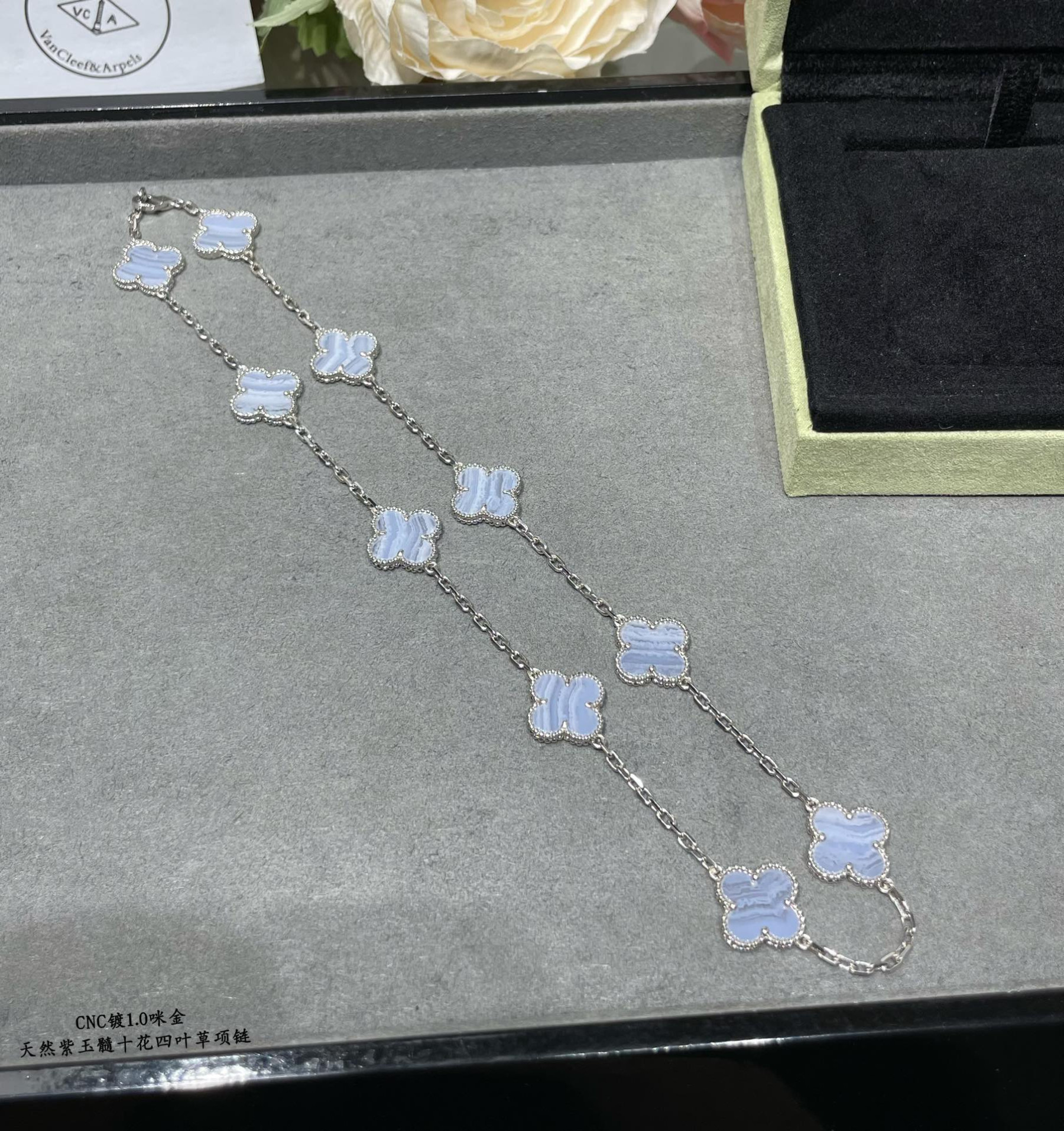 V*n Cl**f & Arpels apphire Blue Purple Agate Clover Necklace Diameter approx 1.5cm,Chain length approx 40+5cm
