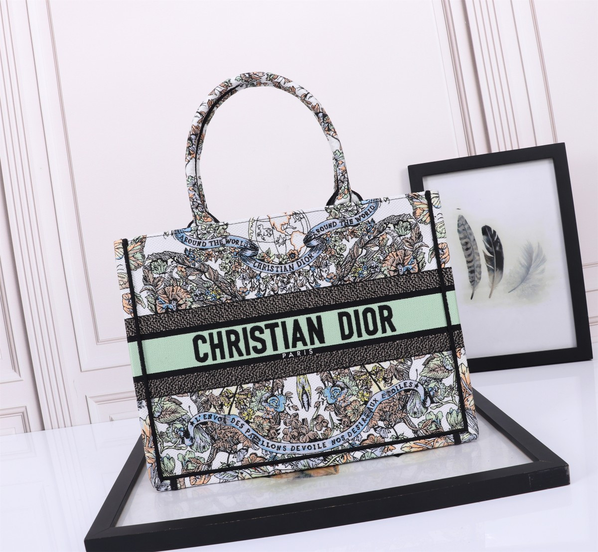 medium D*or book tote white multicolor toile de jouy mexico embroidery 14 x 11 x 6.5 inches